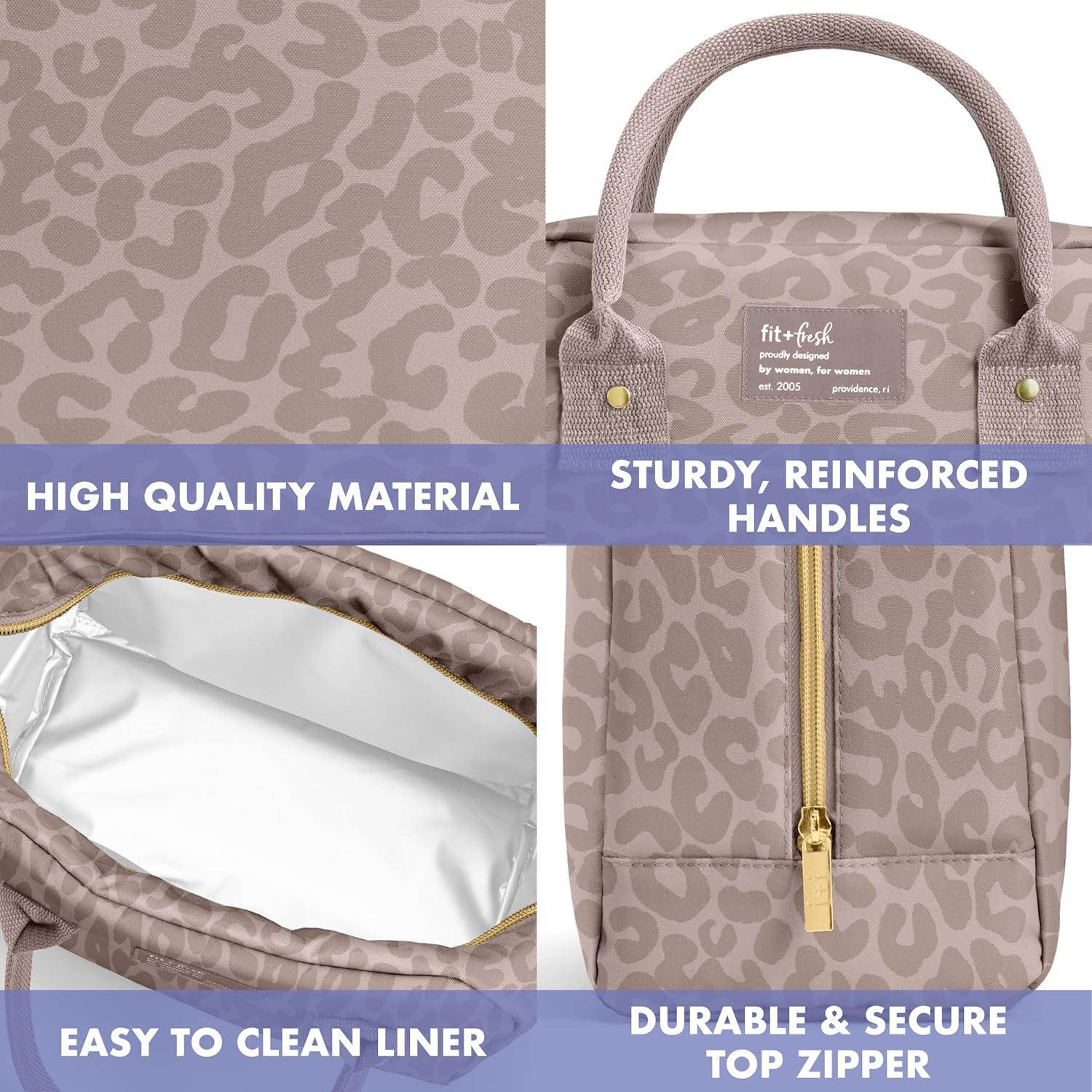 Fit & Fresh Bloomington Lunch Bag for Women - Insulated Large Lunch Box for Work with Containers, Leak-Resistant, Stain-Resistant, Zipper Closure, Mauve(Mocha Feline Fine)