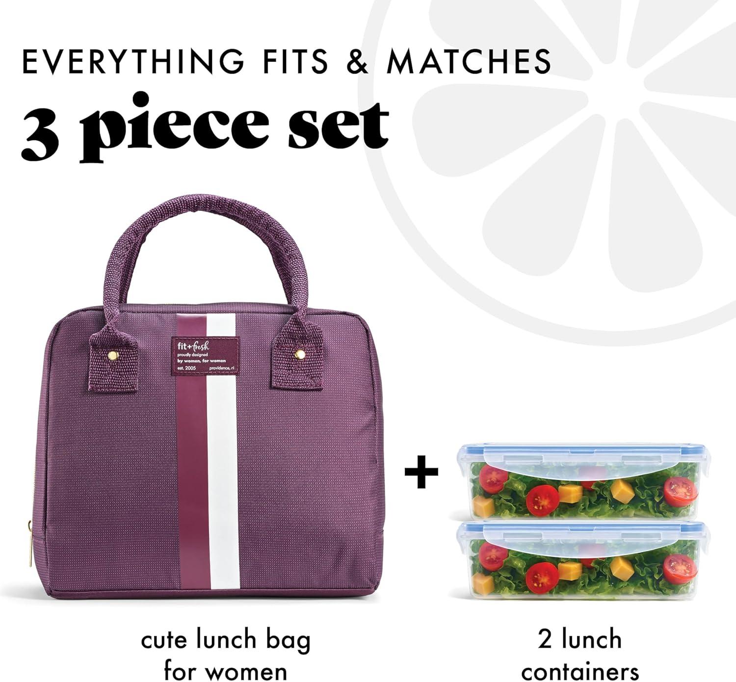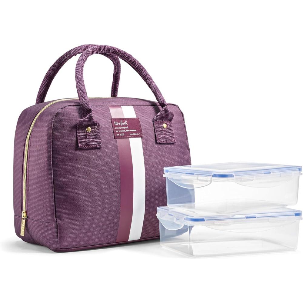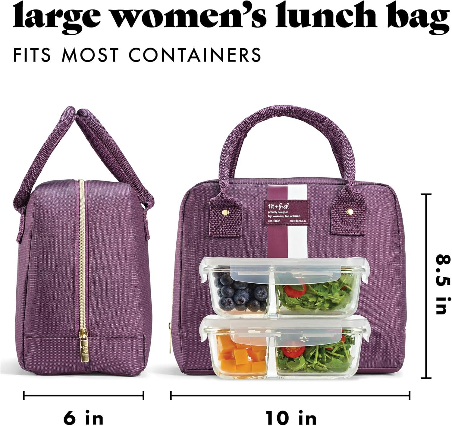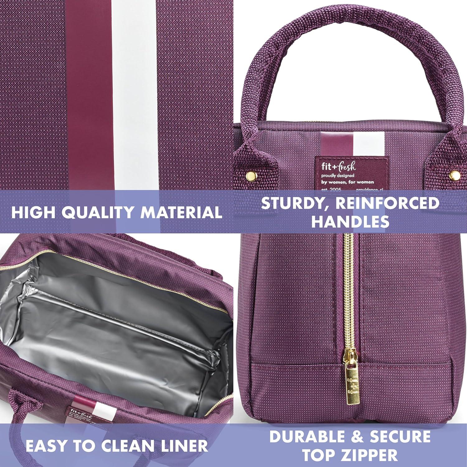 Fit & Fresh Bloomington Lunch Bag for Women - Insulated Large Lunch Box for Work with Containers, Leak-Resistant, Stain-Resistant, Zipper Closure, Mauve(Plum Stripe)