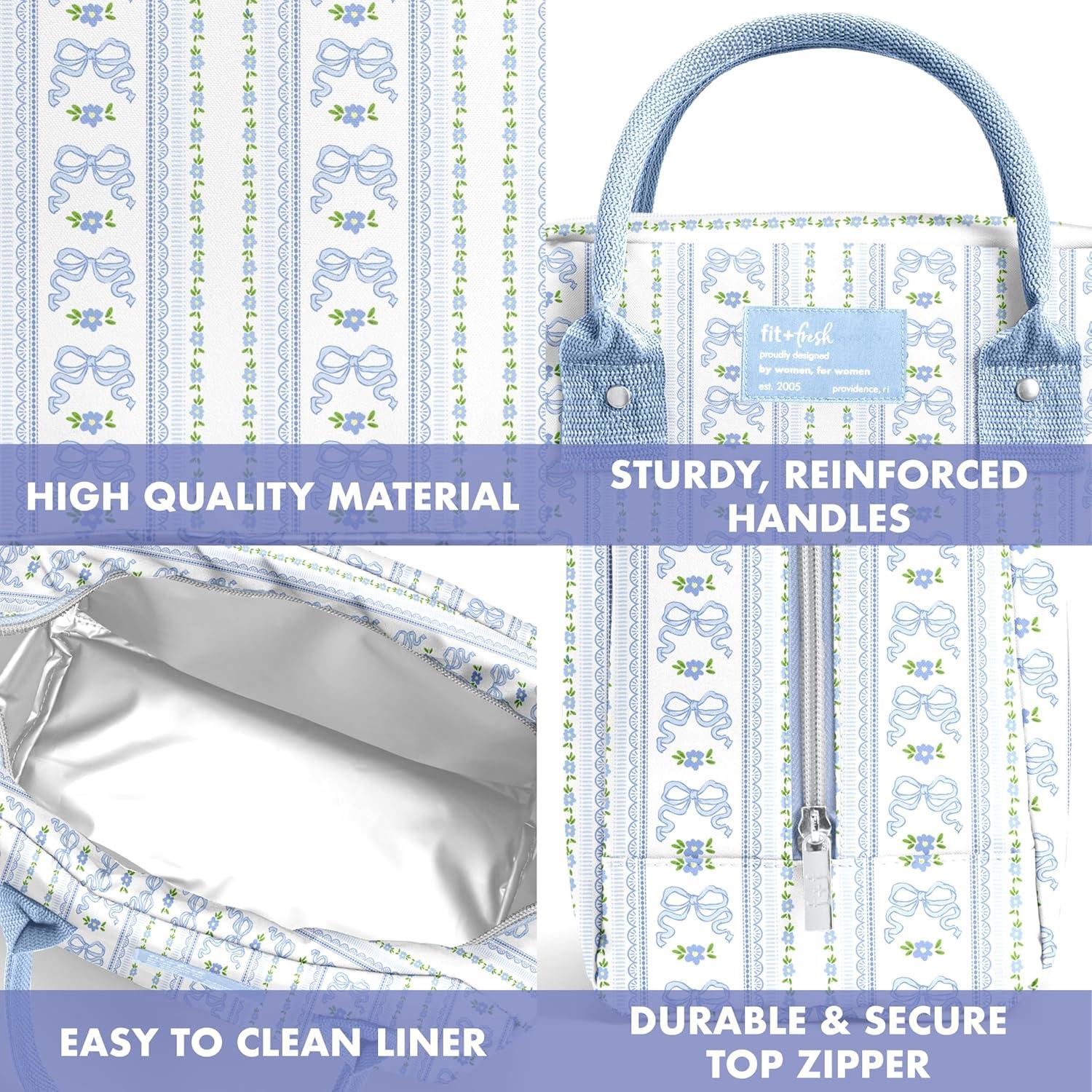 Fit & Fresh Bloomington Lunch Bag for Women – Insulated Large Lunch Box for Work with Containers, Leak-Resistant, Stain-Resistant, Zipper Closure, Pink Dainty Bows(Light Blue Wallpaper Bows)