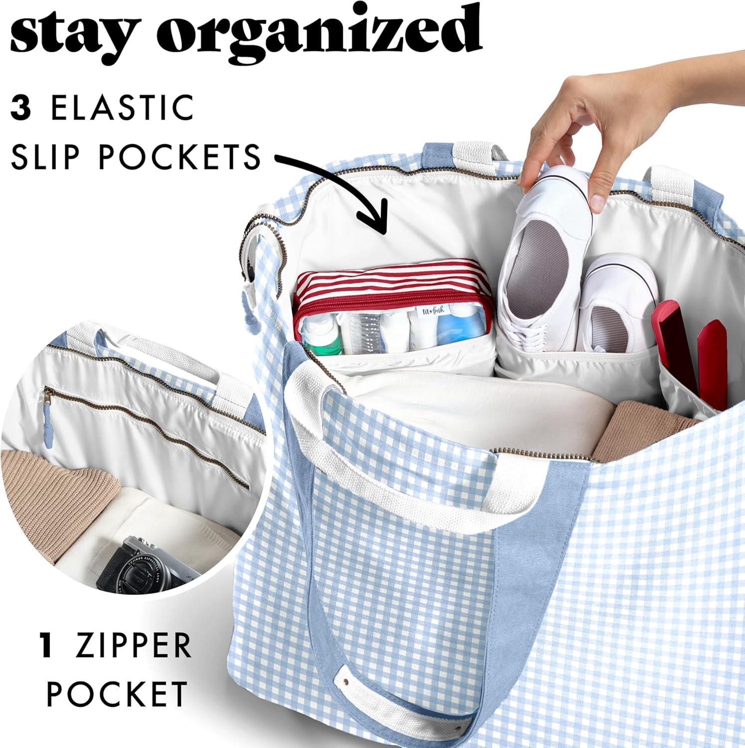 Fit & Fresh Large Beach Bag for Women - Extra Large Travel Tote With Pockets(Blue Gingham)