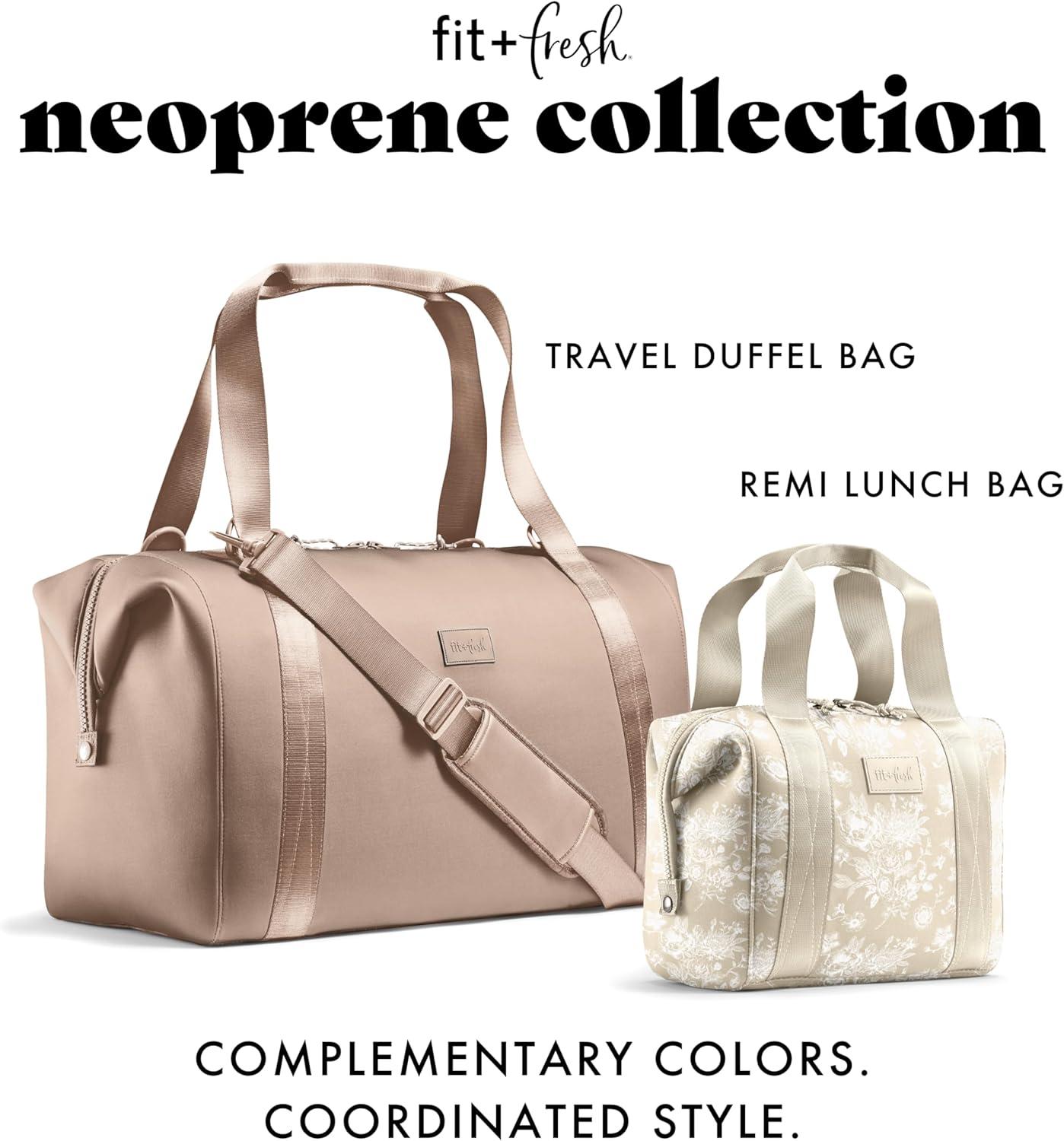 The Remi, effortlessly chic, it includes four matching containers – each measuring 1 cup – ensuring your meals stay fresh and organized. Designed for both convenience and style, this spacious bag features two straps, two zipper pulls, and insulated, machine washable neoprene. Measuring 10″L x 9″H x 6″W, its durable, stain and tear resistant exterior houses a roomy interior, complete with a wide top opening for seamless meal retrieval. Whether you're seeking an insulated lunch bag, a spacious lunch box, or a cute tote for work, we have you covered. Our range includes adult lunch boxes with matching containers, large lunch tote bags, ice packs, travel bags, and more. Crafted with convenience and style in mind, our products offer l insulation to keep your meals hot or cold on the go. Elevate your lunch game with our chic designs, perfect for office lunches or outings. Shop Fit & Fresh and experience the perfect blend of fashion and functionality with our women's lunch bags and boxes.