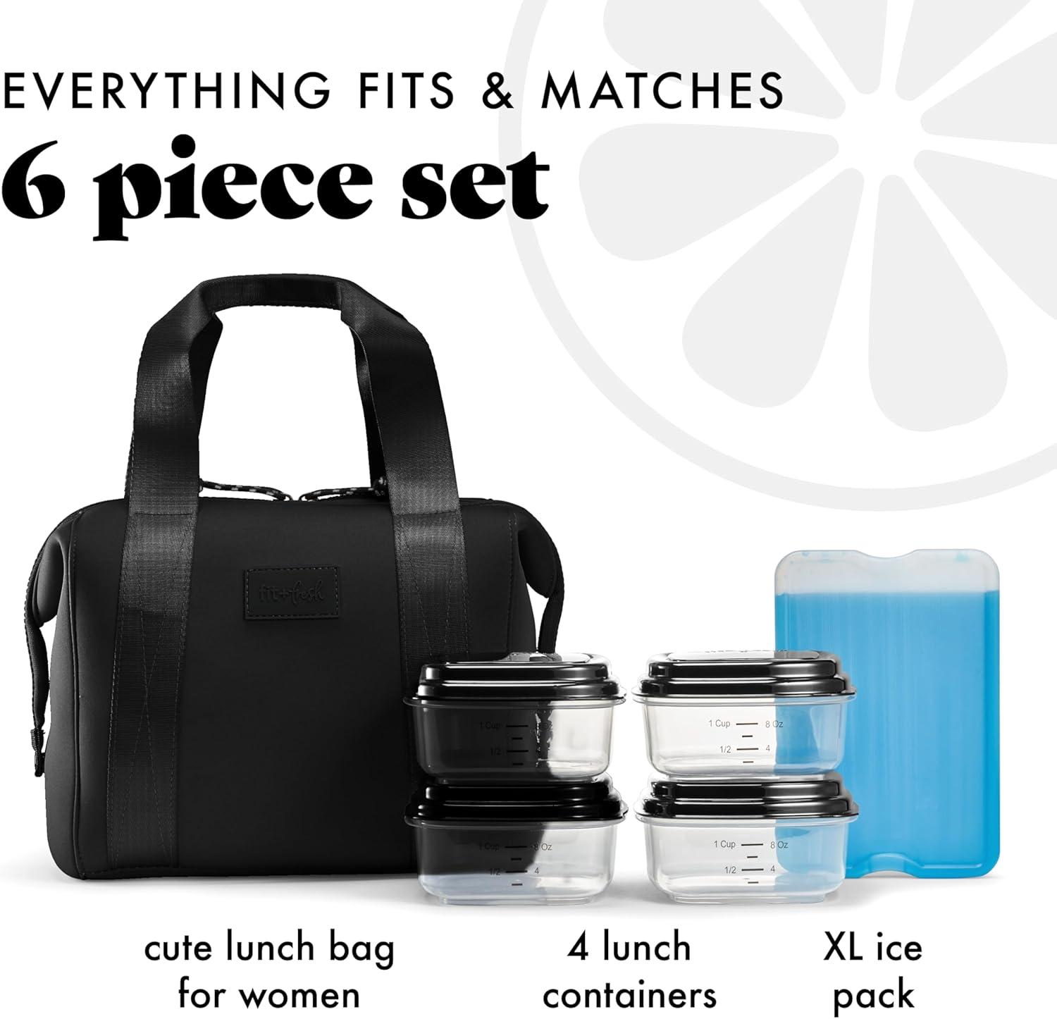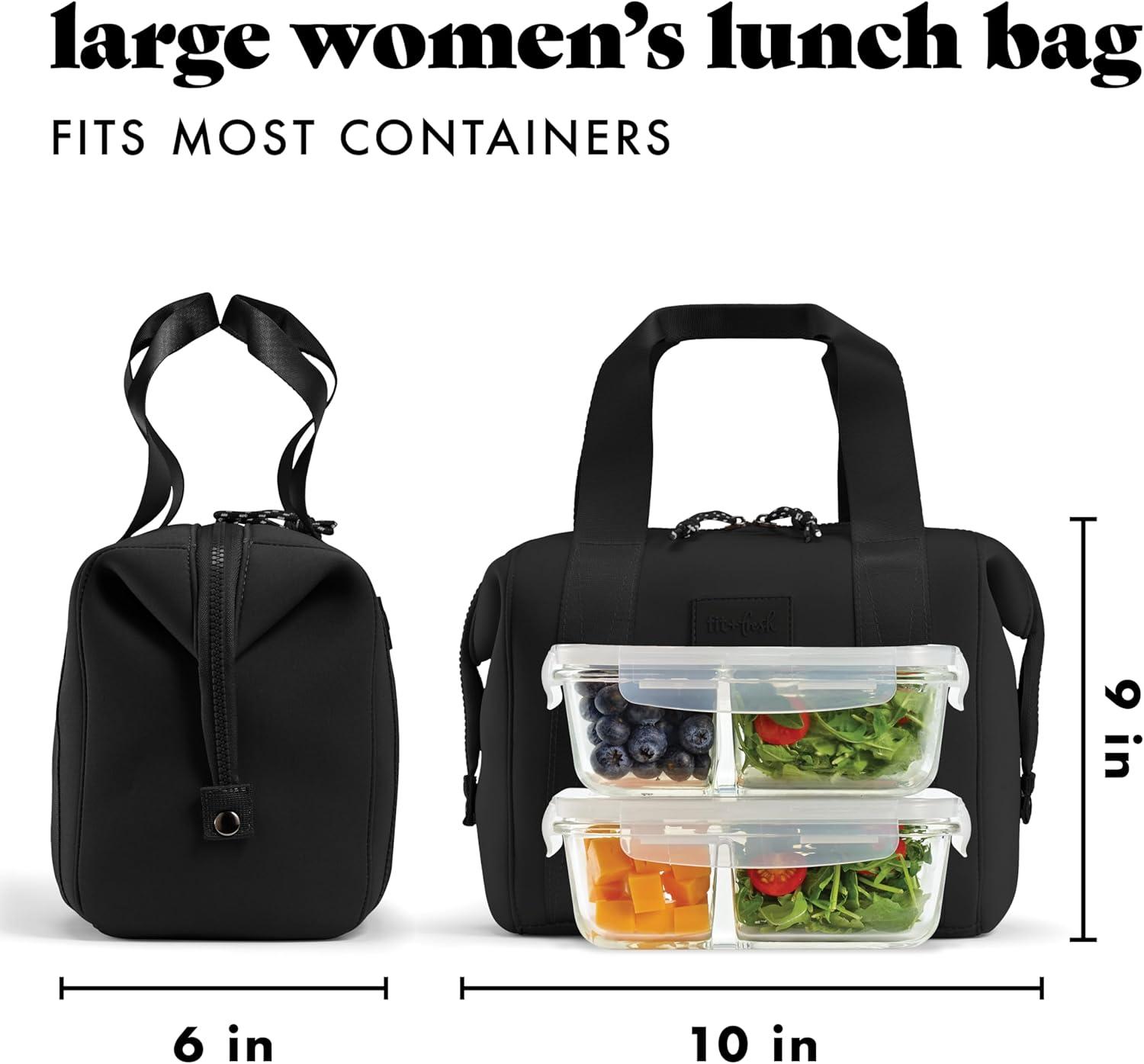 Make lunchtime effortlessly chic and stylish with the Remi Neoprene Lunch Bag for Women by Fit & Fresh! This all-in-one meal prep kit has everything you need to pack, organize, and enjoy your meals on the go. Crafted from premium neoprene-like material, the bag is self-insulating, tear-resistant, and stain-resistant, keeping your food fresh all day. Messes are no problem, just toss it in the washing machine for quick, stress-free cleaning. This complete set comes with four 1-cup matching food containers and an XL cool coolers slim ice pack, so your meals stay cool without the hassle of real ice. Perfect for meal prepping, office lunches, school, or weekend adventures. With a roomy design (10″ x 6″ x 9″), this lunch bag for work fits containers, snacks, drinks, and more. Side snaps allow it to expand for extra space, while the wide top opening and durable handles make packing and carrying a breeze. More than just a lunch bag, it’s an everyday essential, use it as a bottle bag, mini cooler, or even a cosmetic bag. From workdays to weekends, keep your meals fresh and your style on point. Designed by women, for women, Fit & Fresh lunch bags make the perfect gift for moms, sisters, friends, or coworkers. Based in Providence, RI, we combine fashion and function to create a lunch bag that’s as practical as it is chic.