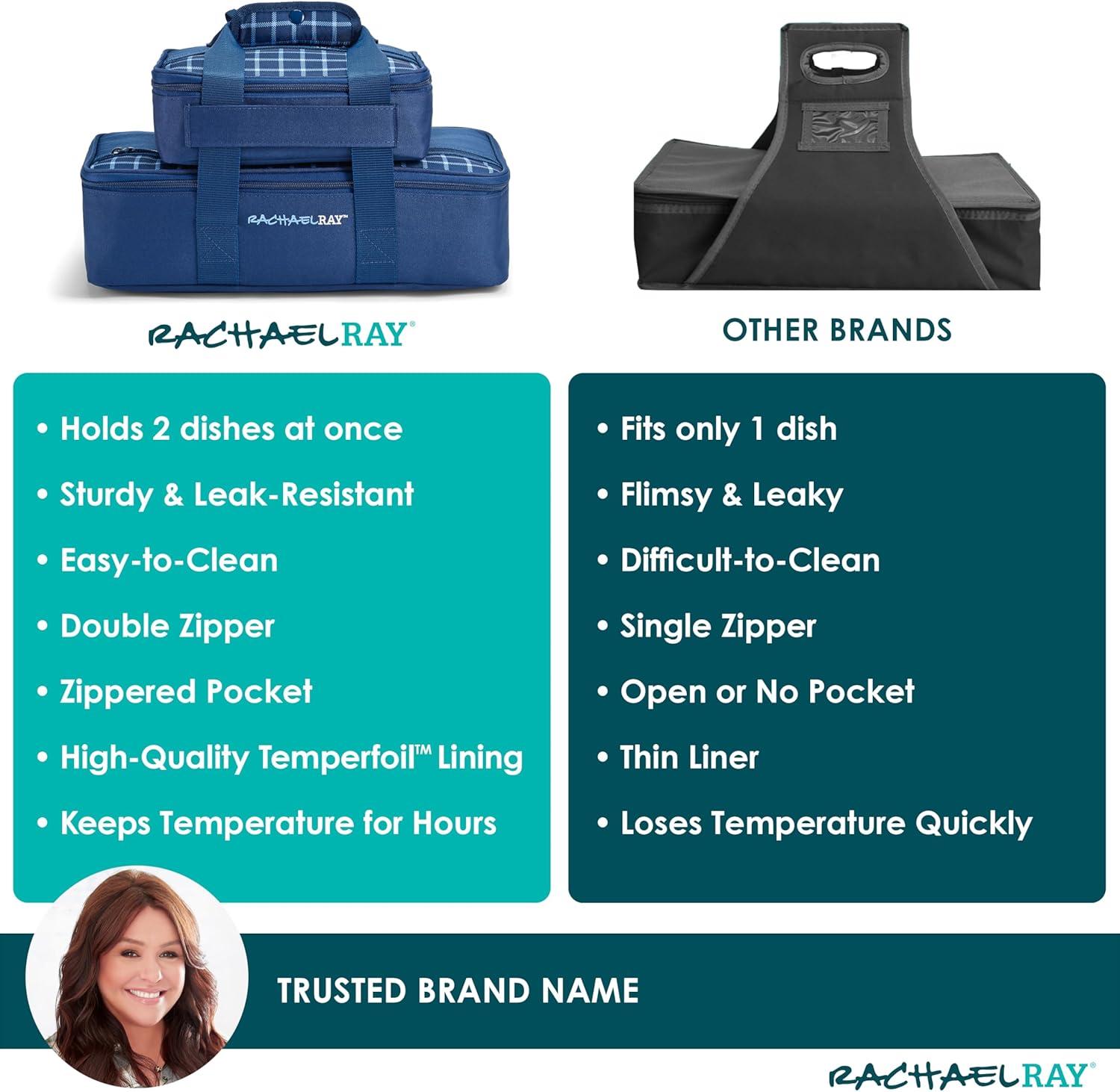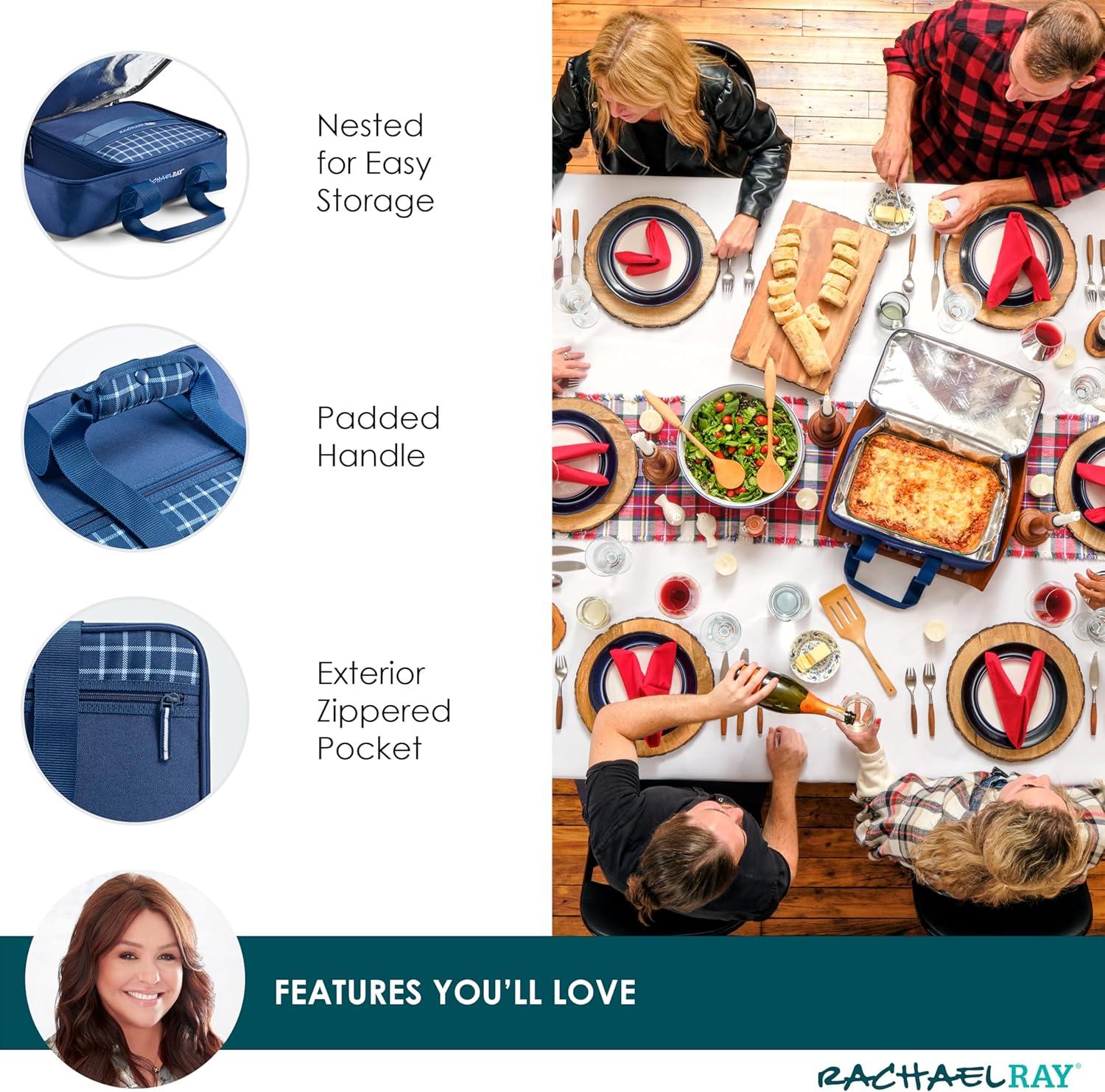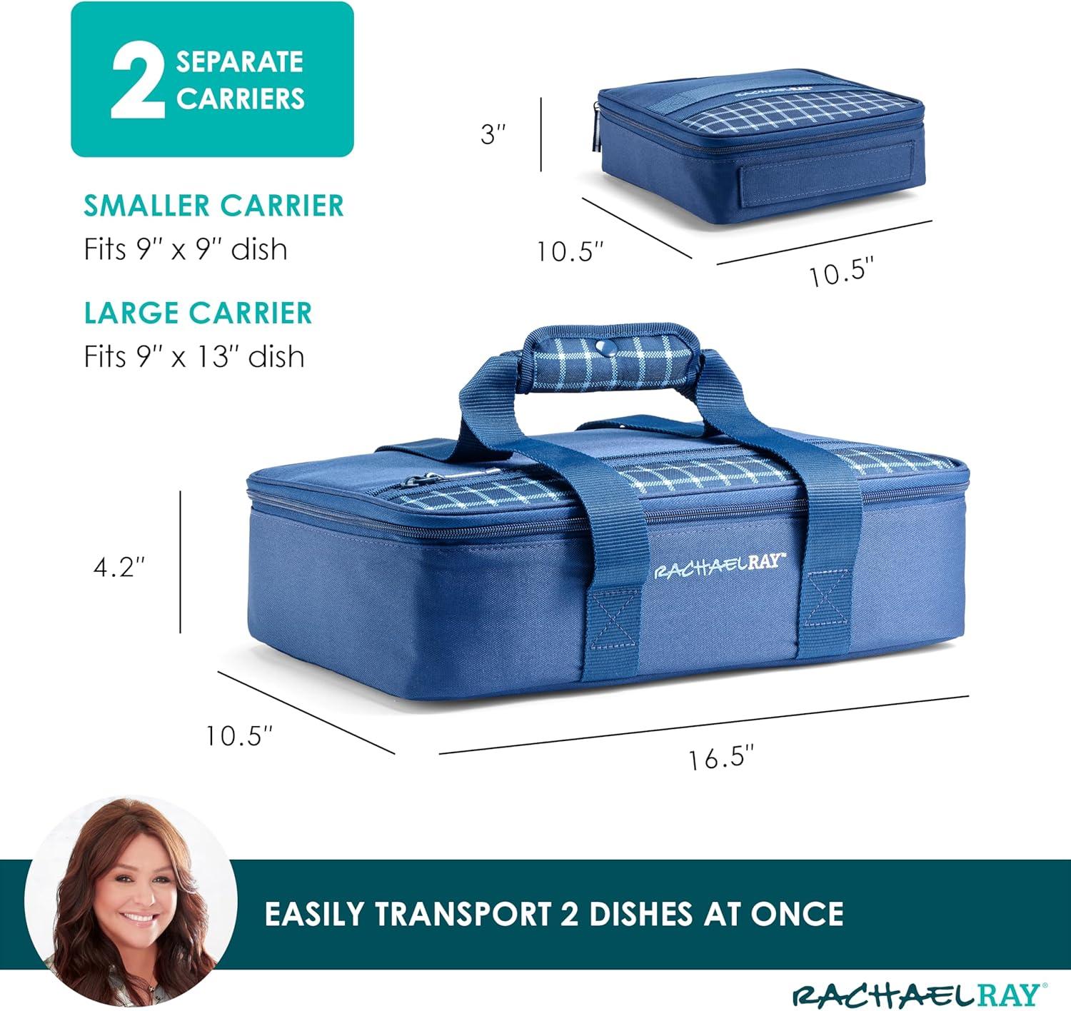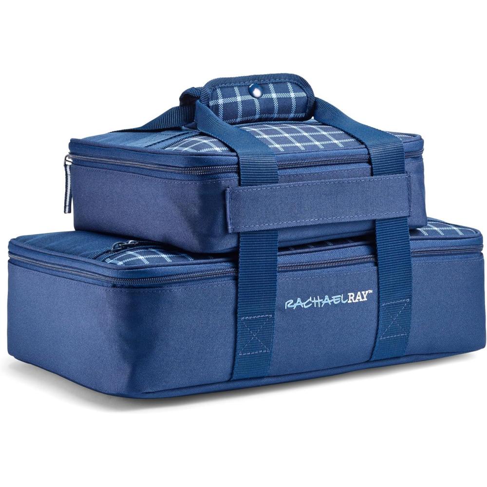 Rachael Ray Lugger Duo, Insulated Casserole Carrier for Hot or Cold Food, Thermal Lasanga Lugger Tote for Potluck, Parties, Picnic, and Cookouts, Fits 9" x 13" Baking Dish, Slate Stripe(Navy Gingham)