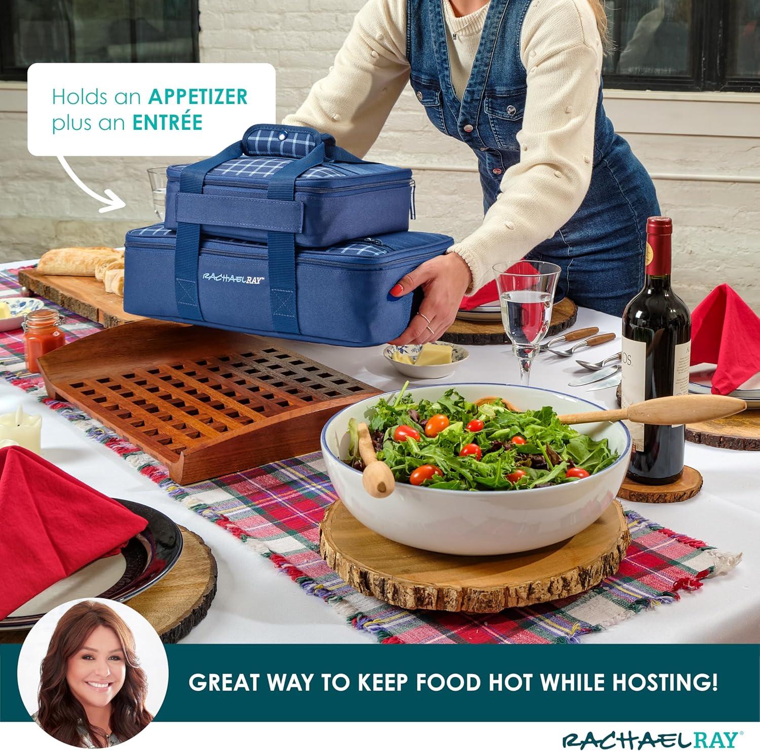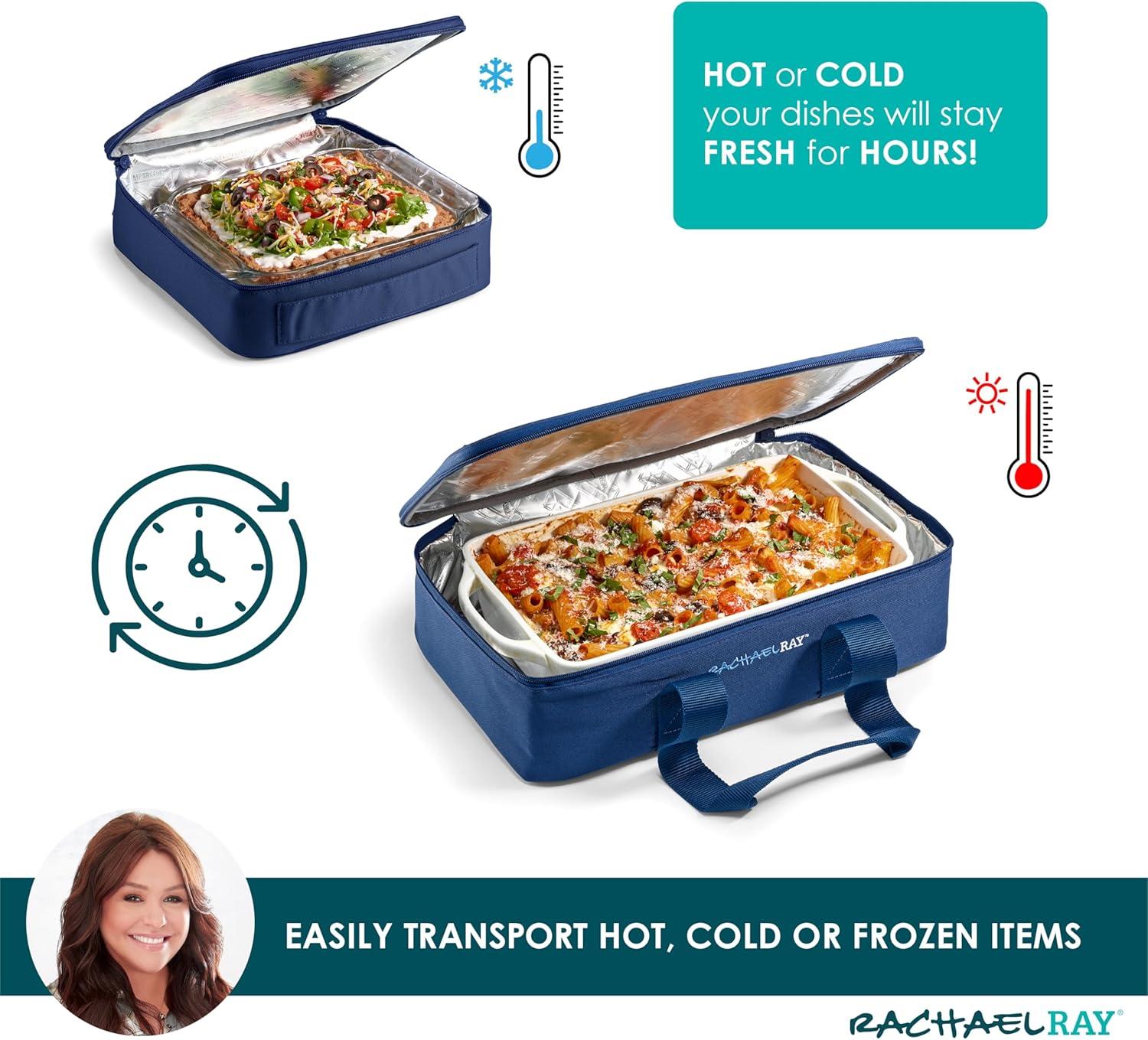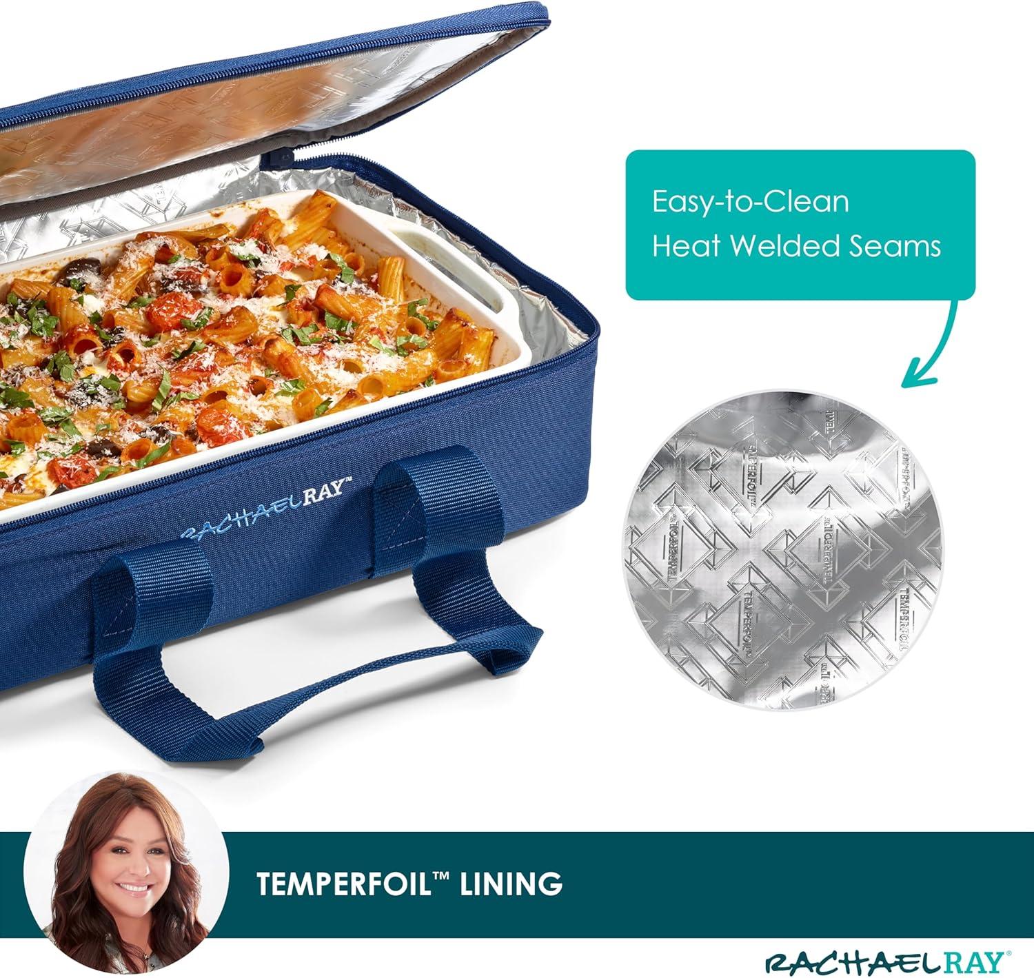 Rachael Ray Lugger Duo, Insulated Casserole Carrier for Hot or Cold Food, Thermal Lasanga Lugger Tote for Potluck, Parties, Picnic, and Cookouts, Fits 9" x 13" Baking Dish, Slate Stripe(Navy Gingham)