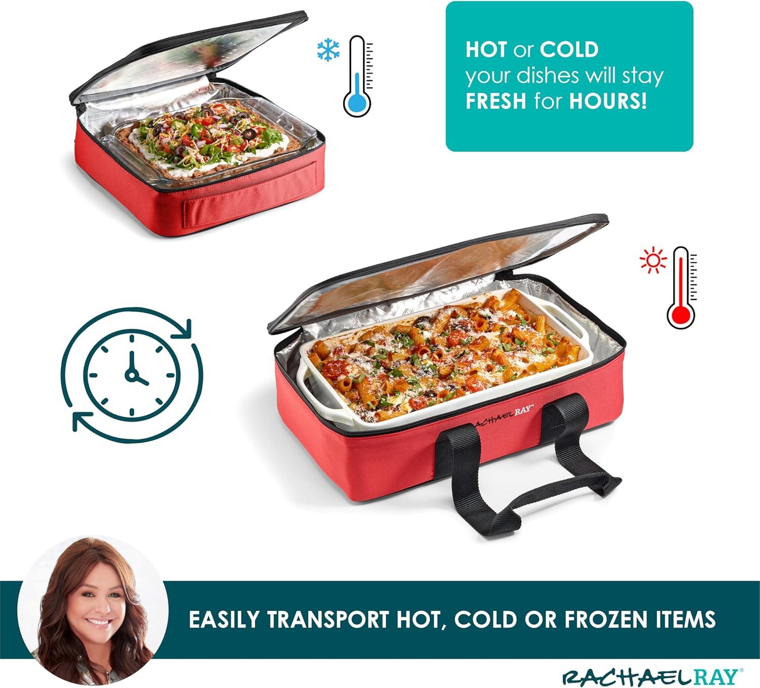Rachael Ray Lugger Duo, Insulated Casserole Carrier for Hot or Cold Food, Thermal Lasanga Lugger Tote for Potluck, Parties, Picnic, and Cookouts, Fits 9″ x 13″ Baking Dish, Slate Stripe(Red Buffalo)